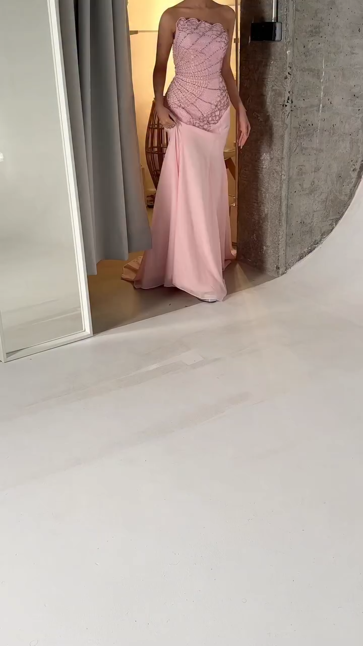 Add a touch of luxury and opulence to your wardrobe with the Ayla Pink Strapless Dress. This exquisitely designed gown features a glamorous scalloped strapless neckline, a figure-sculpting mermaid maxi silhouette crafted from premium chiffon fabric, and intricate handcrafted beaded & sequin embroidery that forms elegant fan-like patterns, exuding timeless red-carpet glamour. The bold, eye-catching beading detailing and tailored fit make it the perfect statement piece for gala events, evening soirees, or any glamorous special occasion, and it is a must-have for any fashion-forward individual.